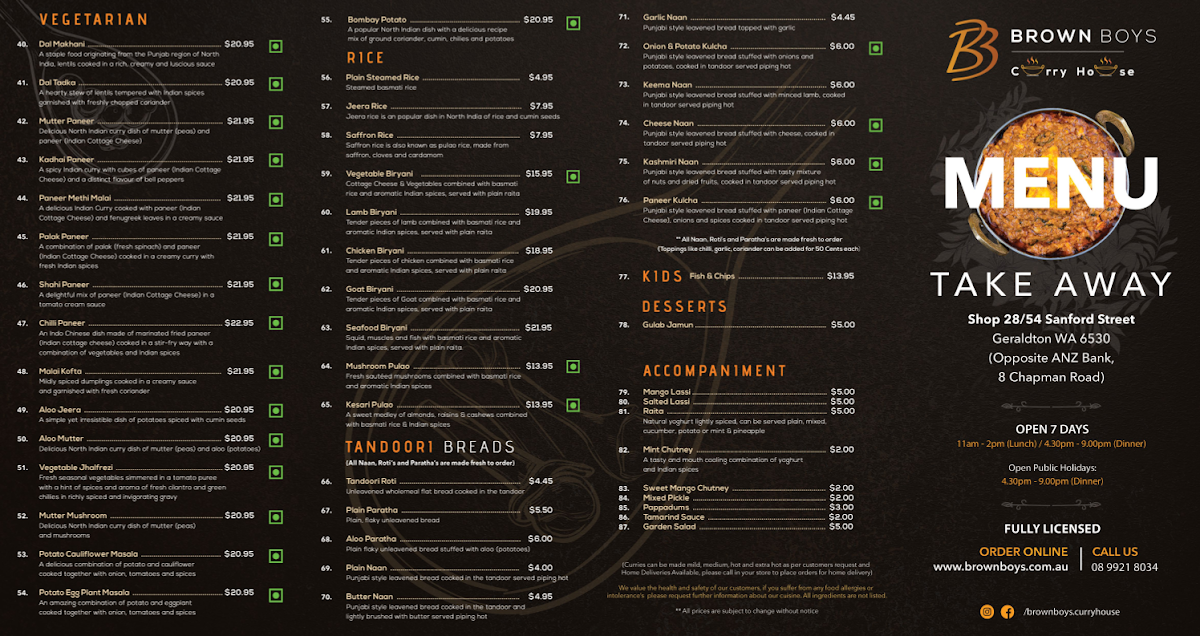 Welcome to Brown Boys Curry House, located at 28/54 Sanford St, Geraldton WA, where authentic Indian cuisine comes alive. This culinary gem has earned rave reviews from food enthusiasts for its commitment to freshness and flavour.